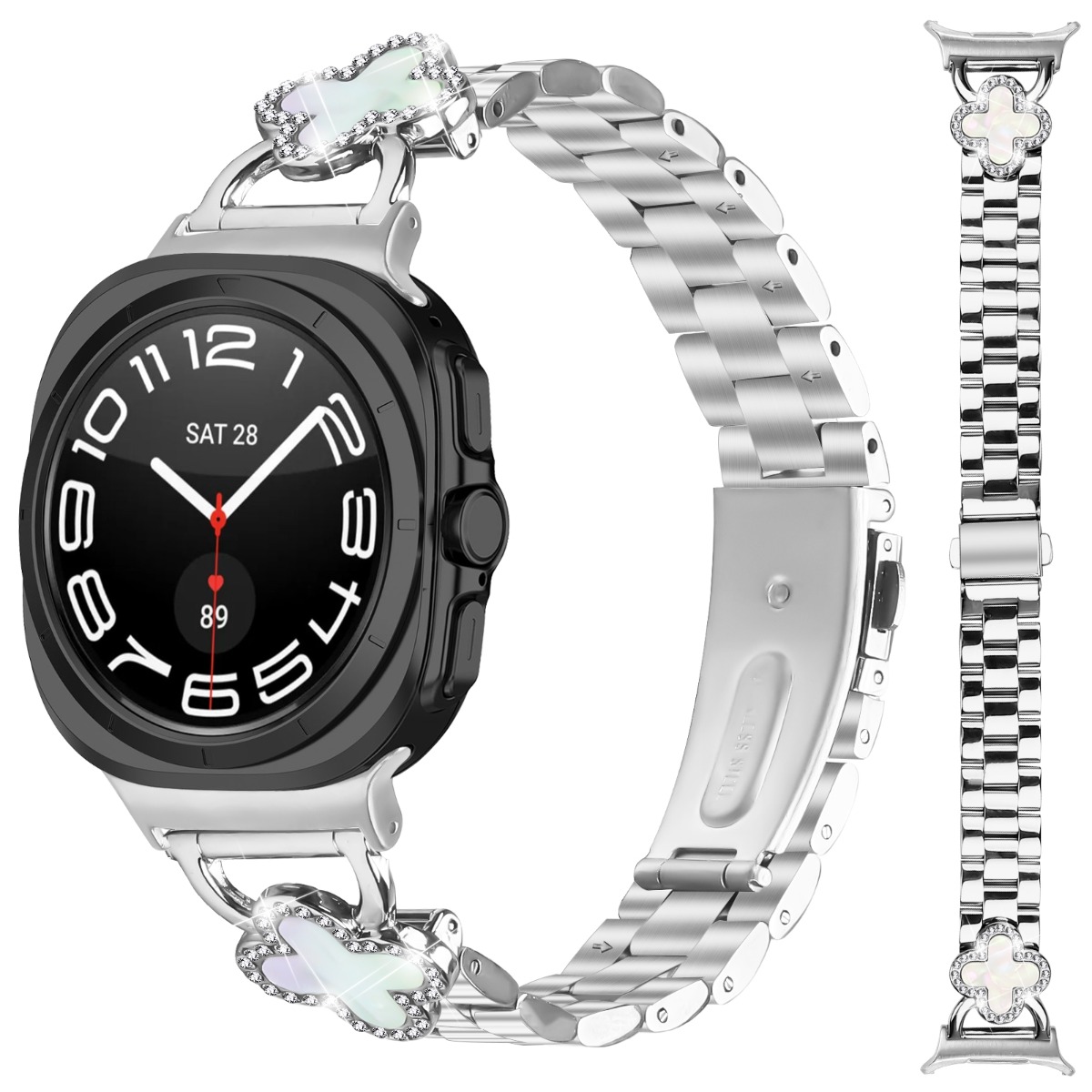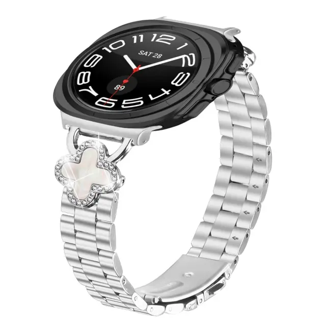 Elegantna zasnova s štiriperesno deteljico: Popestrite svojo uro Samsung Galaxy Watch7 47mm s tem izvrstnim paščkom iz nerjavečega jekla, ki ima nežen obesek v obliki štiriperesne deteljice, izdelan iz nerjavečega jekla in zlitine. Zasnova s štiriperesno deteljico doda pridih prefinjenosti in individualnosti, zaradi česar vaša pametna ura izstopa. Ta pašček je popoln za dodajanje edinstvenega in elegantnega poudarka vašemu vsakdanjemu videzu. Pokažite svoj značilen slog s tem elegantnim dodatkom, ki je združljiv z uro Samsung Galaxy Watch7 47mm.