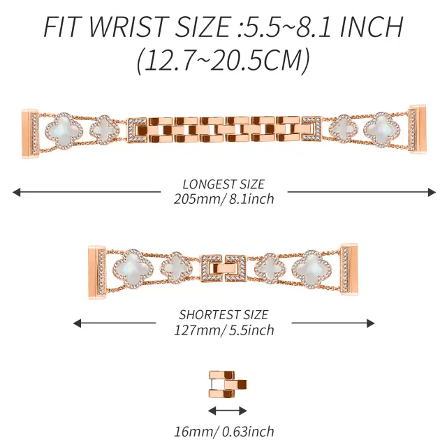 Enostavna namestitev in prilagoditev: Ta pašček je zasnovan za preprosto namestitev in odstranitev. Zatiči za hitro sprostitev vam omogočajo enostavno preklapljanje med različnimi paščki, ki se ujemajo z vašim razpoloženjem ali obleko. Nastavljiva dolžina zagotavlja popolno prileganje za večino velikosti zapestja.