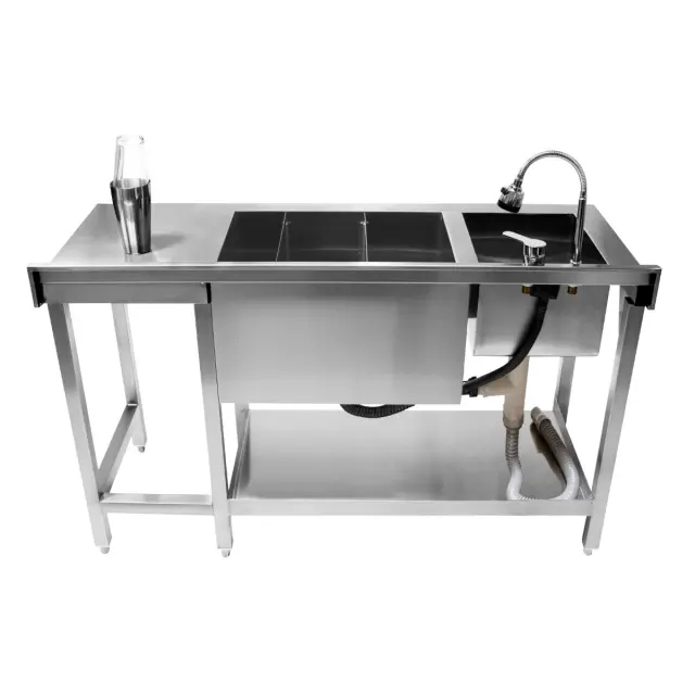 Ta postaja za koktajl bar, izdelana iz visokokakovostnega nerjavečega jekla #304 za živila, je izjemno trpežna in izjemno enostavna za čiščenje. Velik vgradni pomivalnik je opremljen s 360-stopinjsko vrtljivo mešalno pipo, ki zagotavlja pomivanje posode brez napora in težav, tako da so vaši stresalniki in oprema vedno pripravljeni na akcijo.