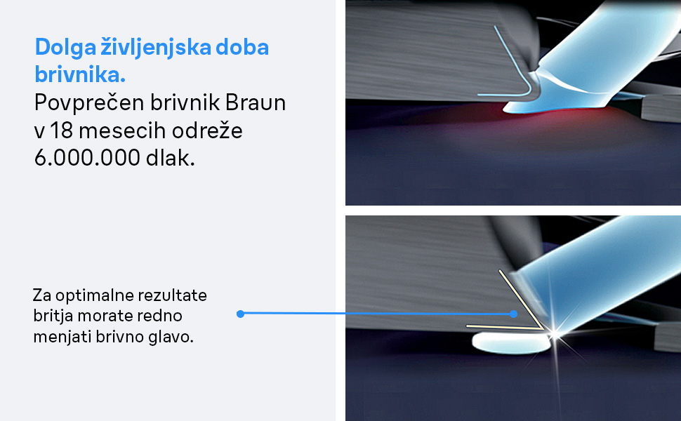 Povprečni brivnik Braun odreže šest milijonov dlak vsakih 18 mesecev. To pomeni, da se glava postopoma obrabi in vaše britje lahko postane manj temeljito in udobno. Zato Braun priporoča, da zamenjate mrežico in blok rezil vsakih 18 mesecev, saj tako ohranite kar najboljše stanje svojega brivnika. Poskrbite za svoj brivnik in on bo poskrbel za vas. Vsebina škatle: 1 x ORIGINALNA nadomestna glava za brivnik Series 3