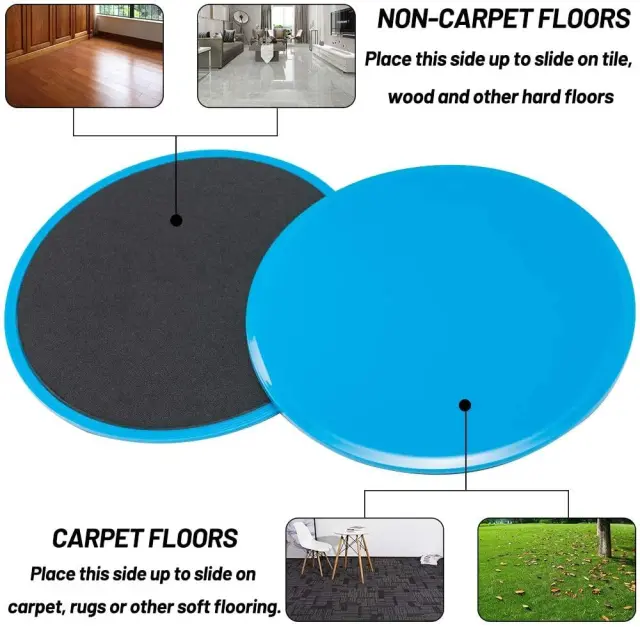 Deluje na vseh površinah: Drsne plošče imajo dve različni strani, tako da drsijo na vseh vrstah tal in površin, tako na trdih tleh, kot so lesene ali plastične preproge, kot na mehkih površinah, kot so preproge ali trava.