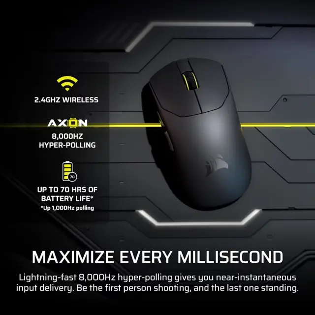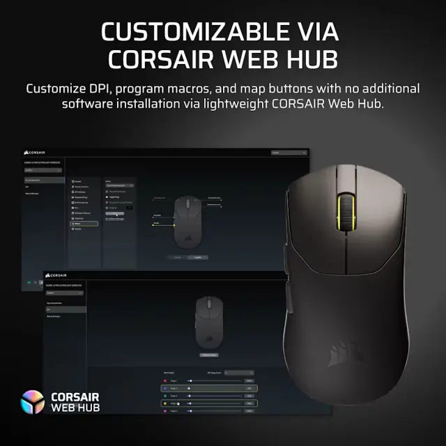 Brezžična povezava zagotavlja popolno svobodo gibanja, miška pa je prilagodljiva preko Corsair Web Hub vmesnika za enostavno nastavitev funkcij in profilov.