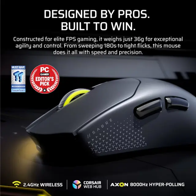 Corsair SABRE V2 PRO Ultralight Wireless je vrhunska gaming miška, zasnovana za profesionalne FPS igralce, ki zahtevajo izjemno hitrost, natančnost in popoln nadzor. Z izjemno lahko konstrukcijo in naprednimi tehnologijami zagotavlja konkurenčno prednost pri vsakem premiku.