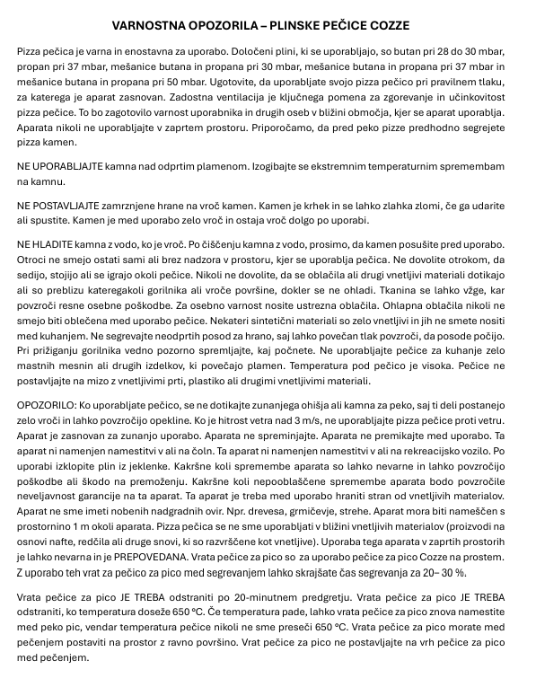 Pizza pečico uporabljajte izključno na prostem, z ustreznim plinom in tlakom. Zagotovite dobro prezračevanje za varno uporabo. Kamen pred peko dobro segrejte, ne izpostavljajte ga vodi ali temperaturnim šokom. Pečica in kamen postaneta zelo vroča – nevarnost opeklin. Ne puščajte otrok brez nadzora. Po uporabi izklopite plin. Ne uporabljajte nad gorljivimi materiali ali pod nadstreški.