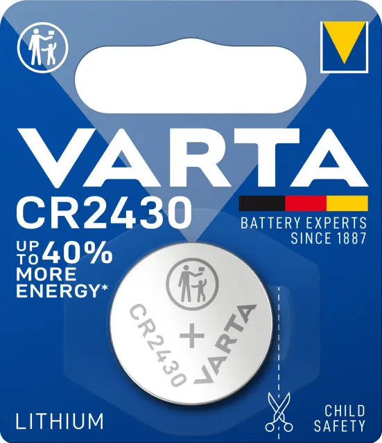 VARTA LITHIUM gumbasta baterija CR2430 3V. Pakiranje vsebuje 1 baterijo. Dimenzije celice: premer 24,5 mm/ višina 3,0 mm