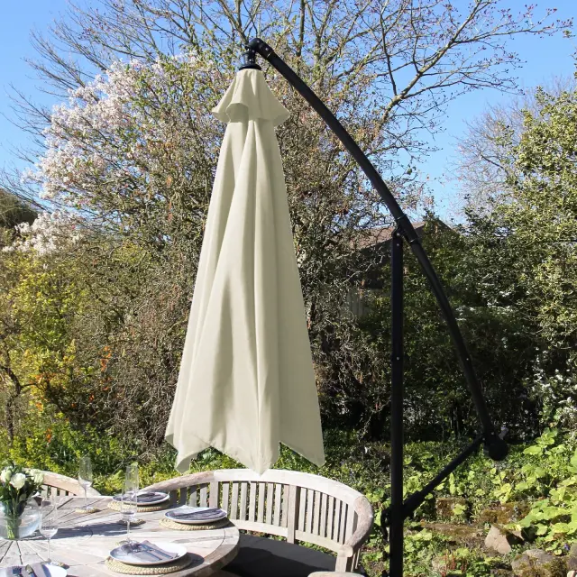 Oblika obešanja tega senčnika pušča stojalo stran od poti, kar vam omogoča, da kar najbolje izkoristite senčeno območje. S stojalom ob strani bo ta privlačen senčnik dopolnjeval vsako zunanje pohištvo.