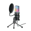 Črn namizni mikrofon z RGB osvetlitvijo in adapterjem USB-C