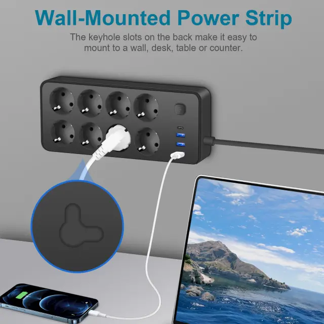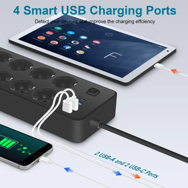 Več možnosti polnjenja: Ta EU standardna vtičnica ima 8 vtičnic, 3 USB priključke in USB-C priključek, kar vam omogoča, da polnite več naprav hkrati. Popolna je za domove ali pisarne s številnimi elektronskimi napravami, saj odpravlja potrebo po več adapterjih in ohranja vaš prostor organiziran. Vključitev USB-C priključka zagotavlja združljivost z najnovejšimi napravami, kar omogoča hitro in učinkovito polnjenje. Razmik med vtičnicami je zasnovan tako, da sprejme večje vtiče, ne da bi blokiral sosednje vtičnice, kar povečuje uporabnost.