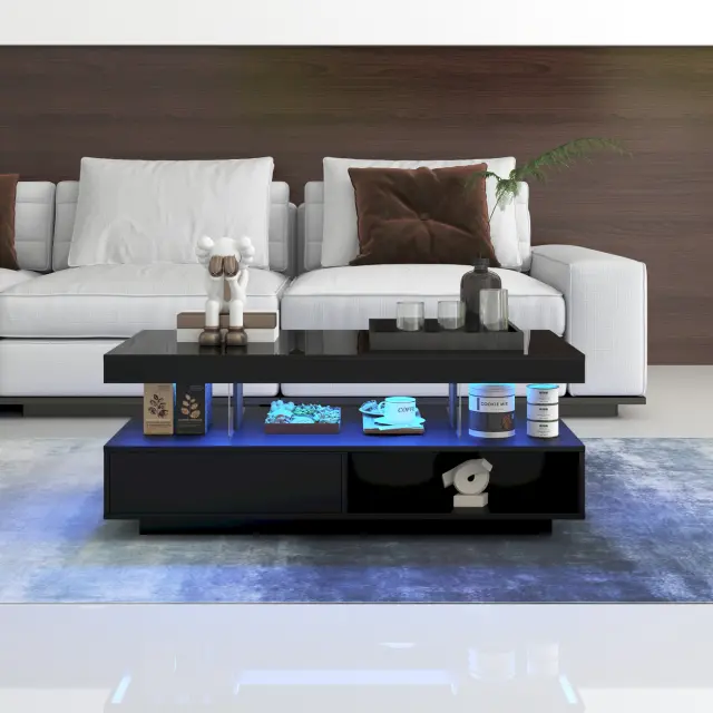 Črna klubska mizica z visokim sijajem s 4 steklenimi policami, 2 predaloma in 2 predelkoma