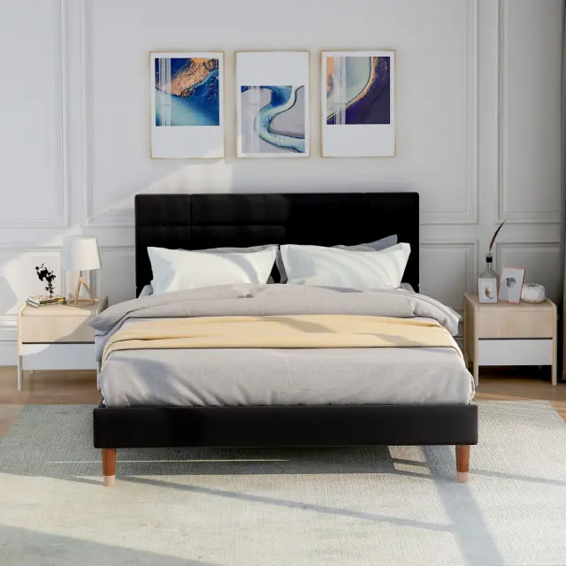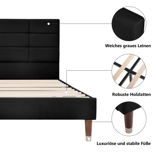 Črna oblazinjena postelja z dvojnim okvirjem iz lana z vzglavjem, 140x200 cm, letveno dno za odrasle/najstnike (vzmetnica ni vključena)