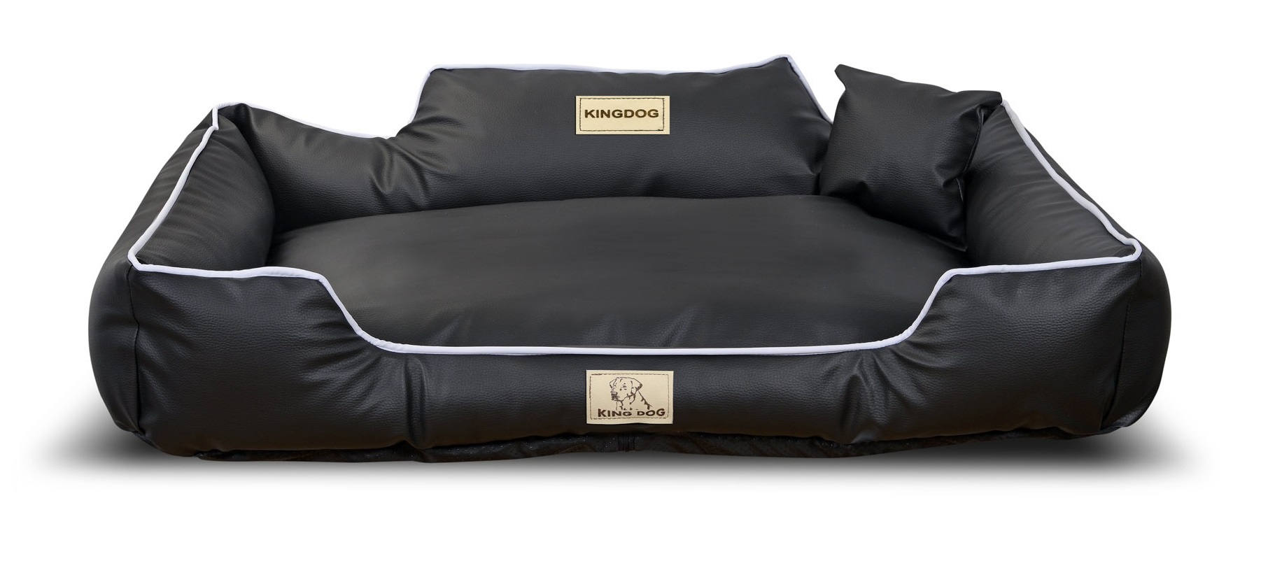 Narejena iz eko usnja, snemljiva z zadrgo, nedrseča pasja postelja KINGDOG v črni barvi z belo obrobo, PERSONALIZIRANA z imenom vašega ljubljenčka!