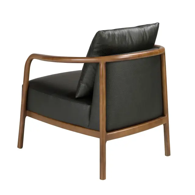Sedež s modernim dizajnom in naslonjali za roke, oblazinjen s črno kravjo kožo. Tako zaradi svojega sloga kot tudi zaradi nog na leseni osnovi v barvi orehovega lesa je ta sedež popolna kombinacija med oblikovanjem in udobjem