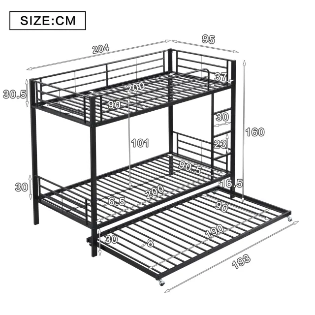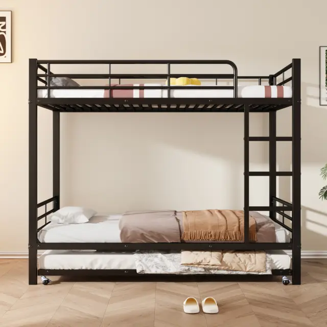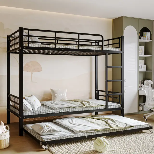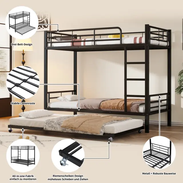 Črna železna pogradna postelja z izvlečnim dnom, primerna za otroke/najstnike, 4 okvirji (90x200cm/90x190cm)