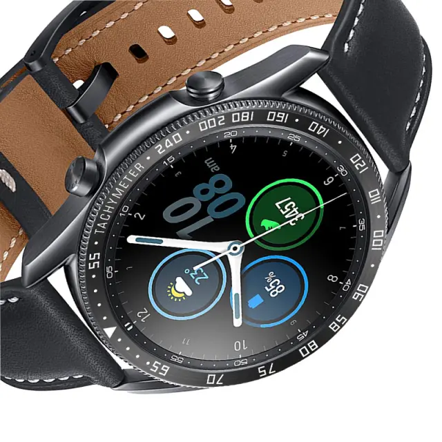 Vrhunsko nerjaveče jeklo: Ta obroba je izdelana iz vrhunskega nerjavečega jekla, ki nudi izjemno odpornost proti koroziji in obrabi. Črna barva z belimi črkami zagotavlja prefinjen in moderen videz, ki dopolnjuje vašo uro Galaxy Watch 3. Visokokakovosten material zagotavlja dolgotrajno delovanje in ohranja svoj videz tudi pri redni uporabi. Izkusite popolno kombinacijo sloga in funkcionalnosti s tem trpežnim obrobjem iz nerjavečega jekla.