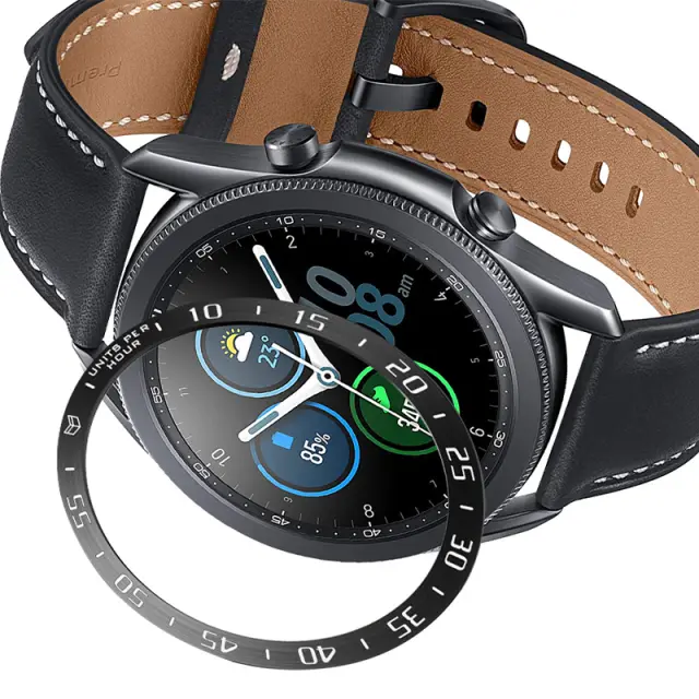 Elegantna prilagoditev: Izboljšajte estetiko svoje ure Galaxy Watch 3 s tem elegantnim črnim okvirjem z jasno belo pisavo. Ta eleganten dodatek vam omogoča, da prilagodite svojo pametno uro, da ustreza vašemu individualnemu slogu. Kontrastne barve ustvarjajo vizualno privlačen videz, ki dopolnjuje vsako obleko ali priložnost. Spremenite svojo uro iz standardne nosljive naprave v moden izraz, ki odraža vašo edinstveno osebnost in okus. To je preprost, a učinkovit način za osvežitev videza vaše ure.