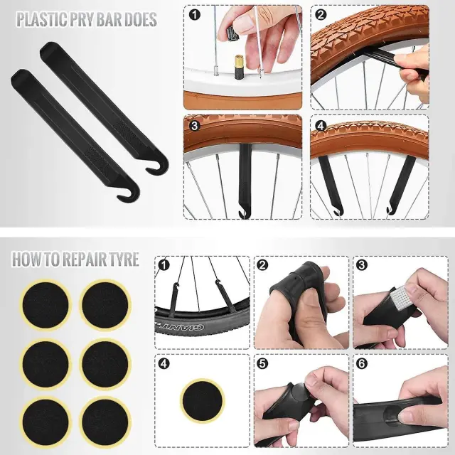 Večnamensko Priložen žepni komplet za popravilo predrtih žog brez lepila in nosilec za kolesarske dodatke ter iglo za žoge za napihovanje športnih žog, kot so košarkarske, nogometne, nogometne in druge. Odlično tudi za gorska in cestna kolesa, e-kolesa kot tudi otroške vozičke, invalidske vozičke.