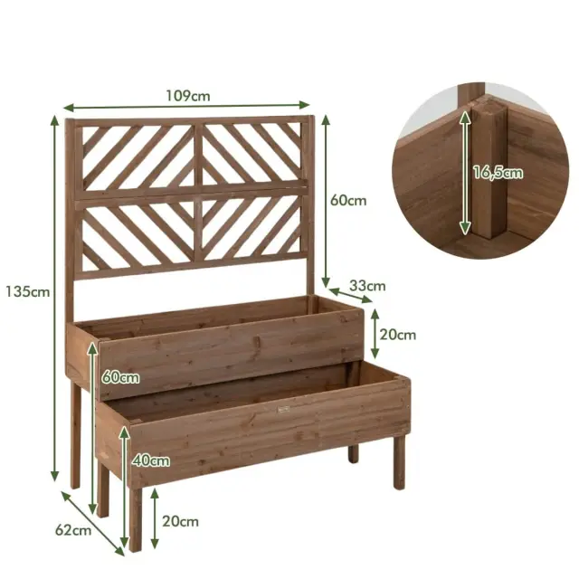 Naša večnamenska dvignjena vrtna greda 2 v 1 je opremljena z dvema velikima zabojoma za sadike in rešetko, pri čemer vsak zaboj meri 109 x 33 x 20 cm (d x š x v), kar zagotavlja dovolj prostora za gojenje različnih rastlin. Mreža je primerna za gojenje plezalk, dodate pa lahko tudi nekaj okraskov ali visečih košar. Zahvaljujoč skrbni zasnovi odvajanja vode vam ni treba skrbeti za kopičenje vode. Poleg tega je zaboj za sadike izdelan iz 100-odstotnega naravnega lesa jelke, ki je odporen na deformacije, vremenske vplive in trpežen. Zato bo ta vrtna greda odlična izbira za vse vrste vrtnarjenja v zaprtih prostorih in na prostem. Z njo lahko zagotovite ne le dobre pogoje za rast rastlin, temveč tudi olajšate upravljanje.