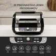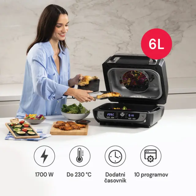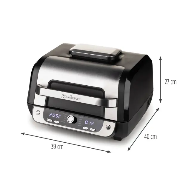 Cvrtnik na vroč zrak Rosmarino AirGrill Pro je vrhunski kuhinjski pomočnik, ki lahko nadomesti več aparatov in poenostavi kuhanje. Z 10 prednastavljenimi programi lahko pripraviš hrustljav krompirček, spečeš sočne zrezke na žaru in pripraviš slastne sladice ali dušeno zelenjavo za zdravo prilogo. Ta cvrtnik z močjo 1700 W ima zgornje in spodnje grelne elemente, ki zagotavljajo popolnoma enakomerno kuhane jedi ob vsaki uporabi. S prostornino 6 L je kot nalašč za družinske obroke in druženje s prijatelji. Upravljanje je povsem enostavno s pomočjo vrtljivega gumba in digitalnega prikaza. Cvrtniku sta priložena tudi pekač iz litega aluminija in steklena pokrovka, ki omogočata soparjenje, dušenje in počasno kuhanje pri odprtem pokrovu. Ta vsestranski aparat se lahko uspešno spopade s praktično vsakim kuharskim izzivom, tebi pa pomaga do profesionalnih rezultatov.