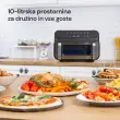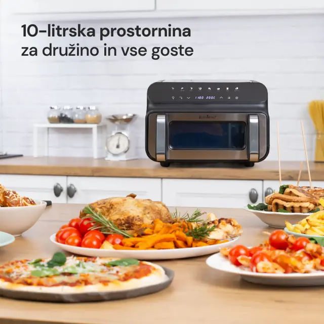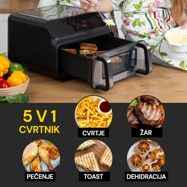 Spoznaj vsestranski cvrtnik Infinity MasterPro 5 in 1. Je največji in najmočnejši član družine cvrtnikov Rosmarino, ki ti olajša praktično vse postopke kuhanja - cvrtje, pečenje, žar, pica, sušenje. V posodi s prostornino 10 litrov lahko pripraviš slane in sladke jedi za vso družino in goste, brez segrevanja pečice in številnih ponev. S tem pomočnikom z veseljem navdušiš goste, saj bodo jedi pripravljena hitro in bolj zdravo. Cvrtnik namreč omogoča do 85 % manjšo uporabo maščob. Ves čas lahko tudi spremljaš potek kuhanja, saj ima predal za cvrtje prozorno okno in lučko v notranjosti. Kaj te bo še navdušilo? Enostavno čiščenje, možnost dehidracije sadja s časovnikom do 24 ur in temperaturni razpon od 50 do 230 °C, da lahko resnično pripraviš vse, kar si zaželiš - topli sendvič, pico, krompirček, meso ali ribe, kruh, sladice in celo že pripravljene jedi, ki potrebujejo le gretje.