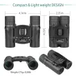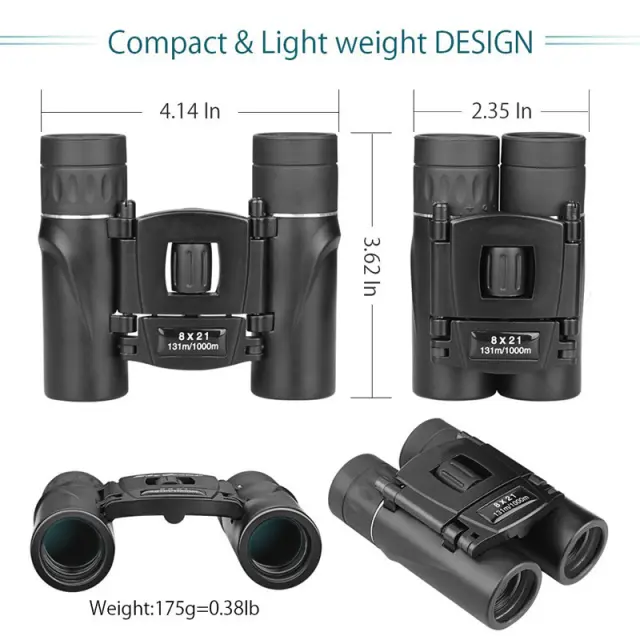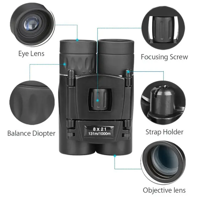Visokokakovostna optika: ta daljnogled, izdelan iz trpežnega ABS-a in optičnega stekla, ponuja sistem povečave 8 x 21 z 21 mm objektivom. Zasnova strešne prizme zagotavlja svetle, jasne slike z minimalnim popačenjem.