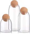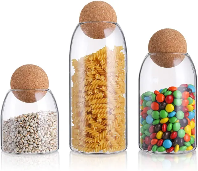 Pregledni stekleni kozarci so idealni za shranjevanje in konzerviranje različnih sestavin, kot so konzerve, marmelade, čatniji, riž, sladkor, moka, čaj, kava, zelišča, začimbe, piškoti in drugo. Poleg tega so na voljo tudi različne suhe rože, kot so posušeni cvetovi sivke in popki vrtnic. zaprti s plutovinasto kroglico, ki jo izolira od zunanjosti in ohranja živila sveža. Z njo lahko izolirate prah in majhne žuželke, kar vam omogoča, da steklenico dolgo ohranite svežo. stekleni kozarci za shranjevanje so izdelani iz visokega borosilikatnega stekla, ki je tanjše, lažje, vzdrži toplotne udarce ter je odporno proti praskam in razbitju. Pokrov okrogle krogle iz plute je izdelan iz naravnega lesa, da vam omogoči zdravo življenje. visoka preglednost, že na prvi pogled lahko vidite, kaj je v notranjosti. Izjemna možnost pranja in vzdržljivost zagotavljata trajnost izdelka. kozarci za shranjevanje hrane za dom in kuhinjo, prihranite hrano in čas.