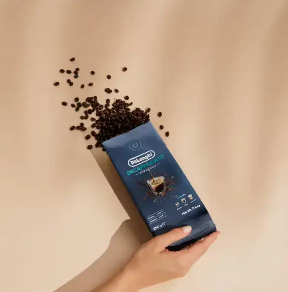 De’Longhi brezkofeinska kava je prefinjena mešanica kavnih zrn, sestavljena iz enakih deležev Arabice in Robuste, naravno dekofeinizirana s postopkom CO₂.