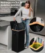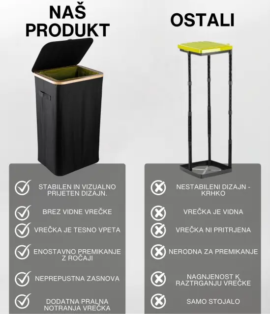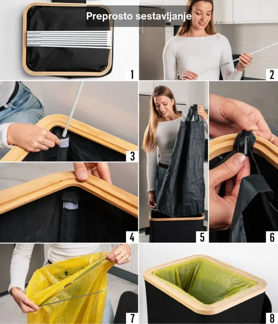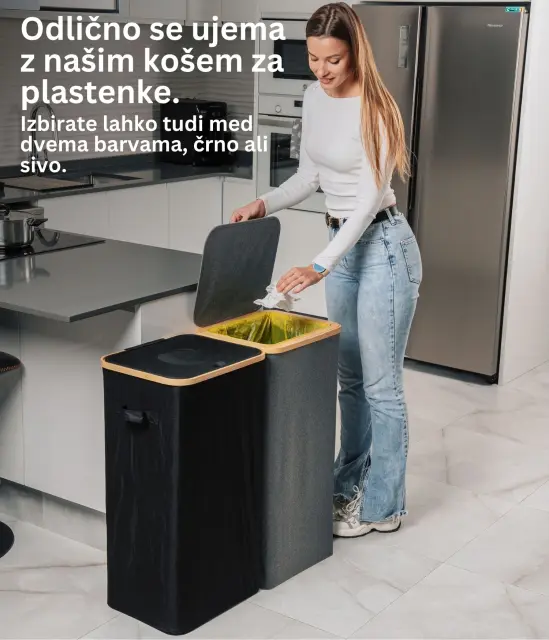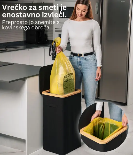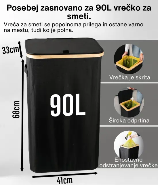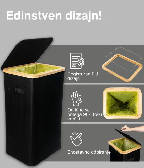 Ta model se ponaša z ojačanimi šivi, trpežnimi materiali in estetsko dovršeno črno barvo, ki se brez težav zlije s katerimkoli prostorom – bodisi moderno pisarno ali minimalistično kuhinjo. Njegova kompaktna, a prostorna zasnova omogoča učinkovito recikliranje, brez da bi zavzel preveč prostora. Poleg tega je košu dodan bambusov okvir z železnim obročem, na katerega se pritrdi vrečka za smeti, kar omogoča enostavno menjavo in uporabo. Koš je zasnovan za 90l vrečke za smeti, vendar lahko brez težav uporabite tudi večje.