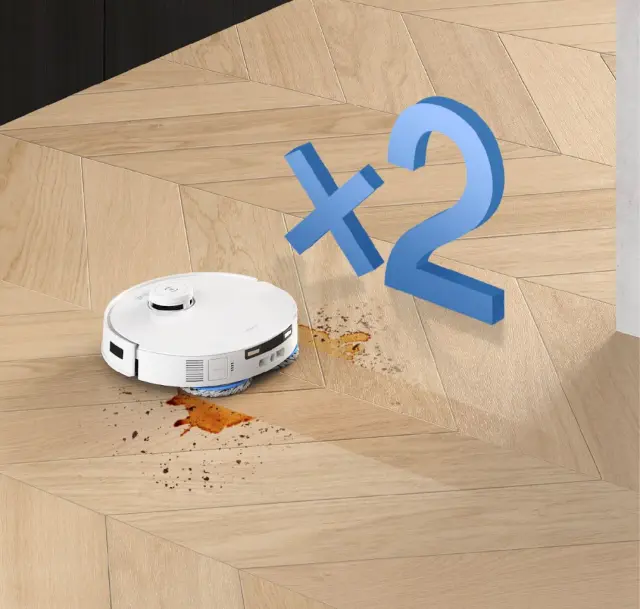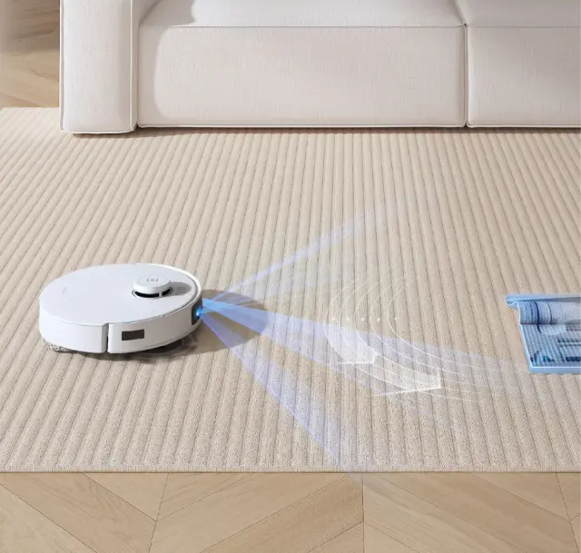 • Sistem dveh vrtljivih krp OZMO Turbo 2.0 iz ženiljske tkanine. Ko robot zazna preprogo, sistem za brisanje s samodejnim dvigom dvigne obe vrtljivi krpi do 9 mm.