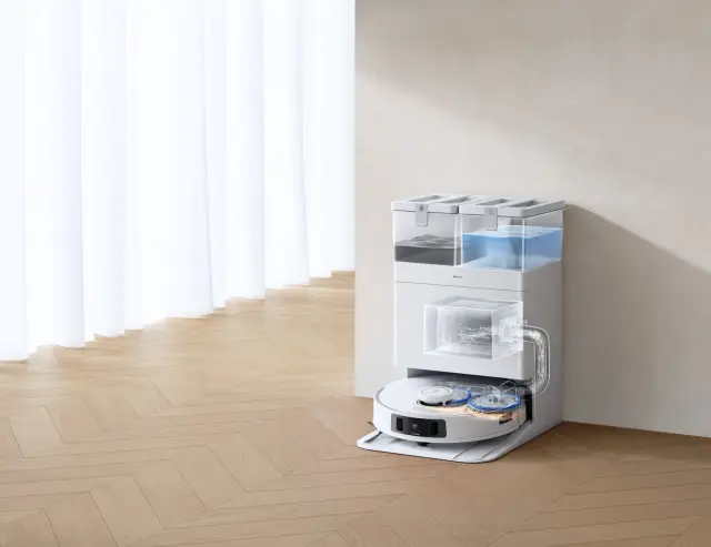 • Postaja vse-v-enem OMNI vrtljivi krpi opere z vodo pri 70°C in posuši s 45°C zrakom. Hkrati avtomatsko izprazni smeti iz koška robotskega sesalnika in rezervoar ponovno napolni z vodo.
