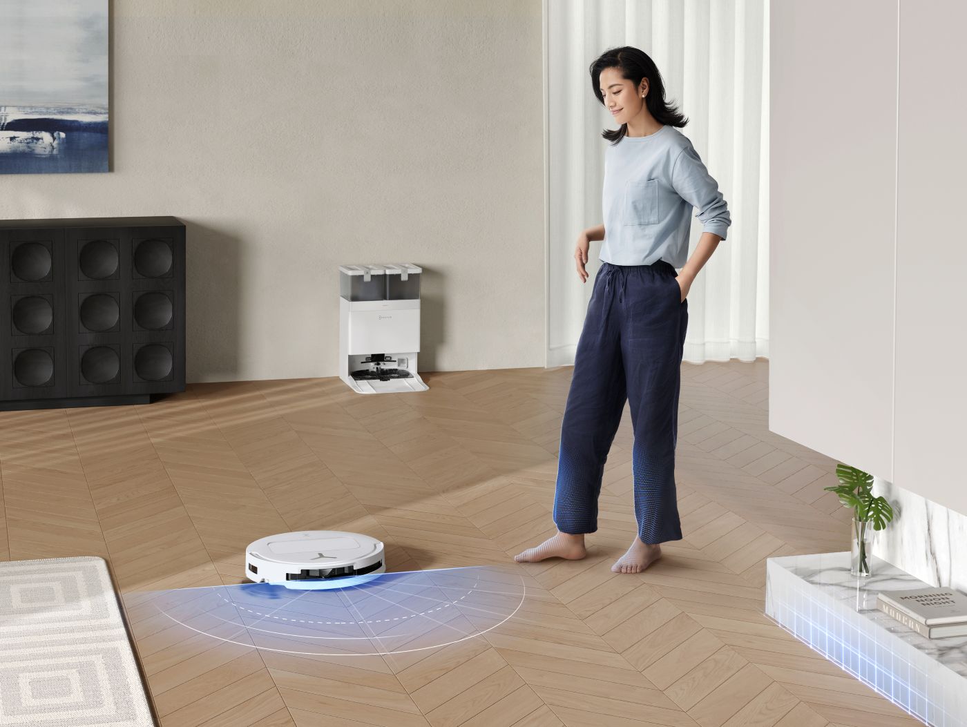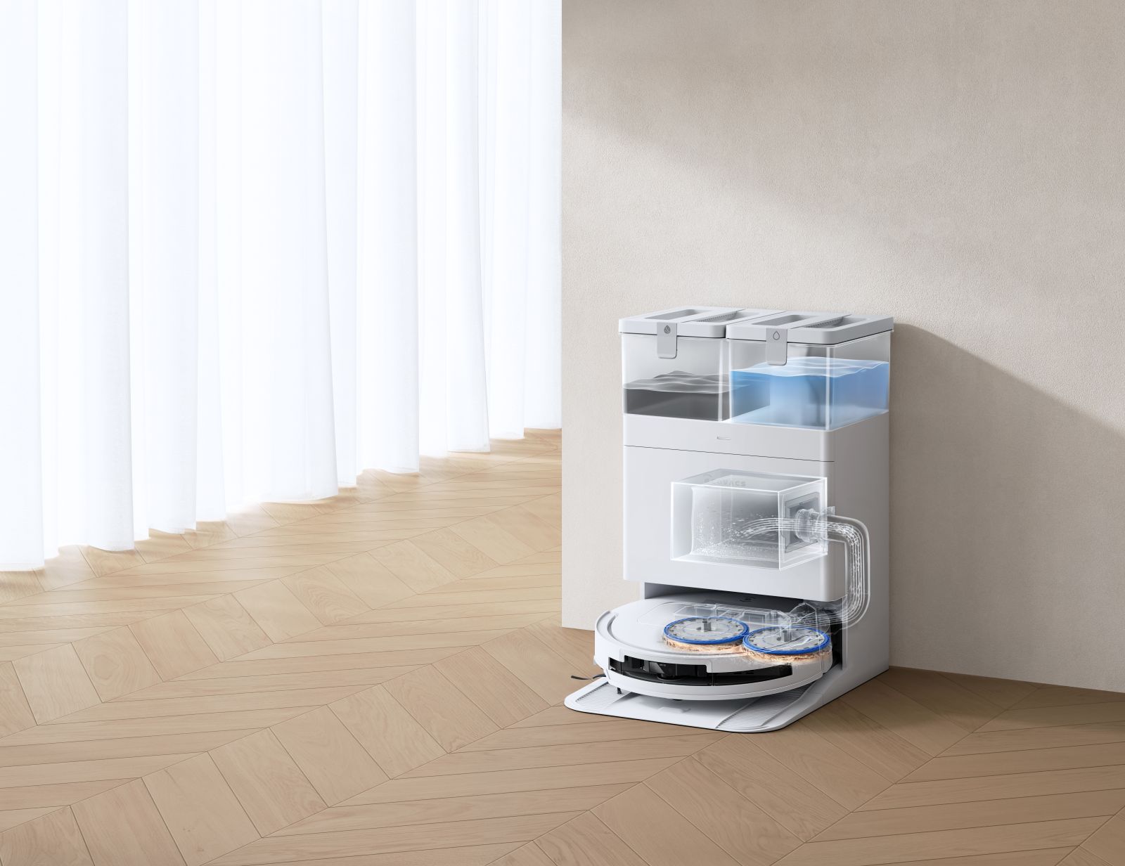 · Postaja vse-v-enem OMNI vrtljivi krpi opere z vodo pri 75°C in posuši s 63°C zrakom. Hkrati avtomatsko izprazni smeti iz koška robotskega sesalnika in rezervoar ponovno napolni z vodo.