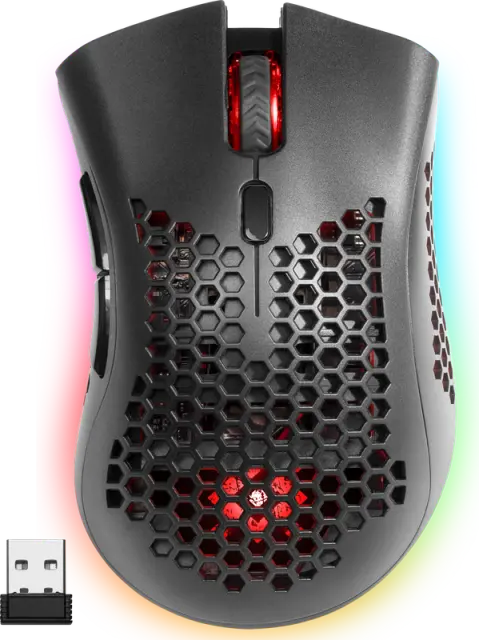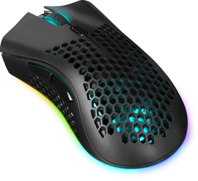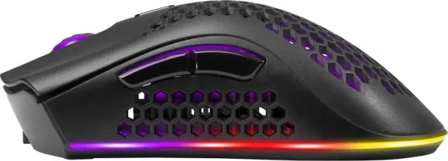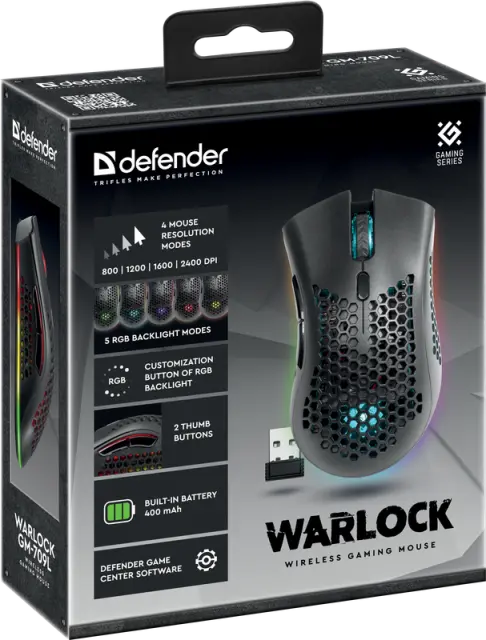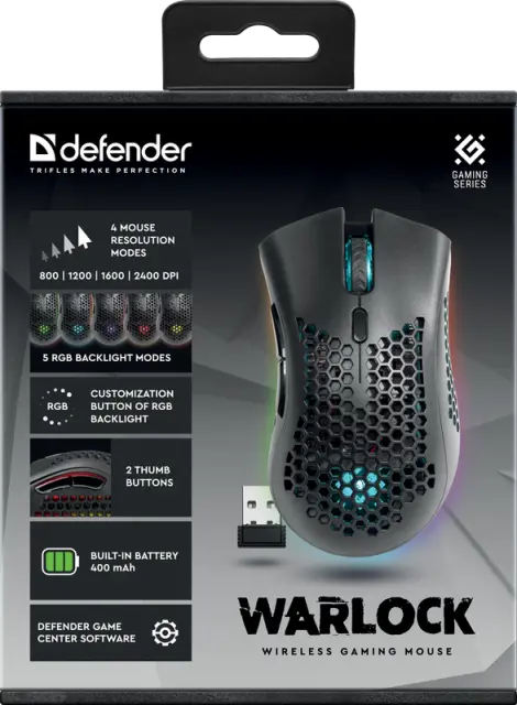 RGB osvetlitev ozadja 5 načinov osvetlitve ozadja Gumb za izbiro osvetlitve ozadja RGB Programska oprema Defender Game Center Brezžična miška Emulacija tipk na tipkovnici Urejevalnik makrov 4 načini ločljivosti miške 2 dodatna stranska gumba mavrična osvetlitev ozadja 5 programabilnih gumbov Vgrajena baterija: 400 mAh Polnjenje preko USB kabla Priložen USB kabel