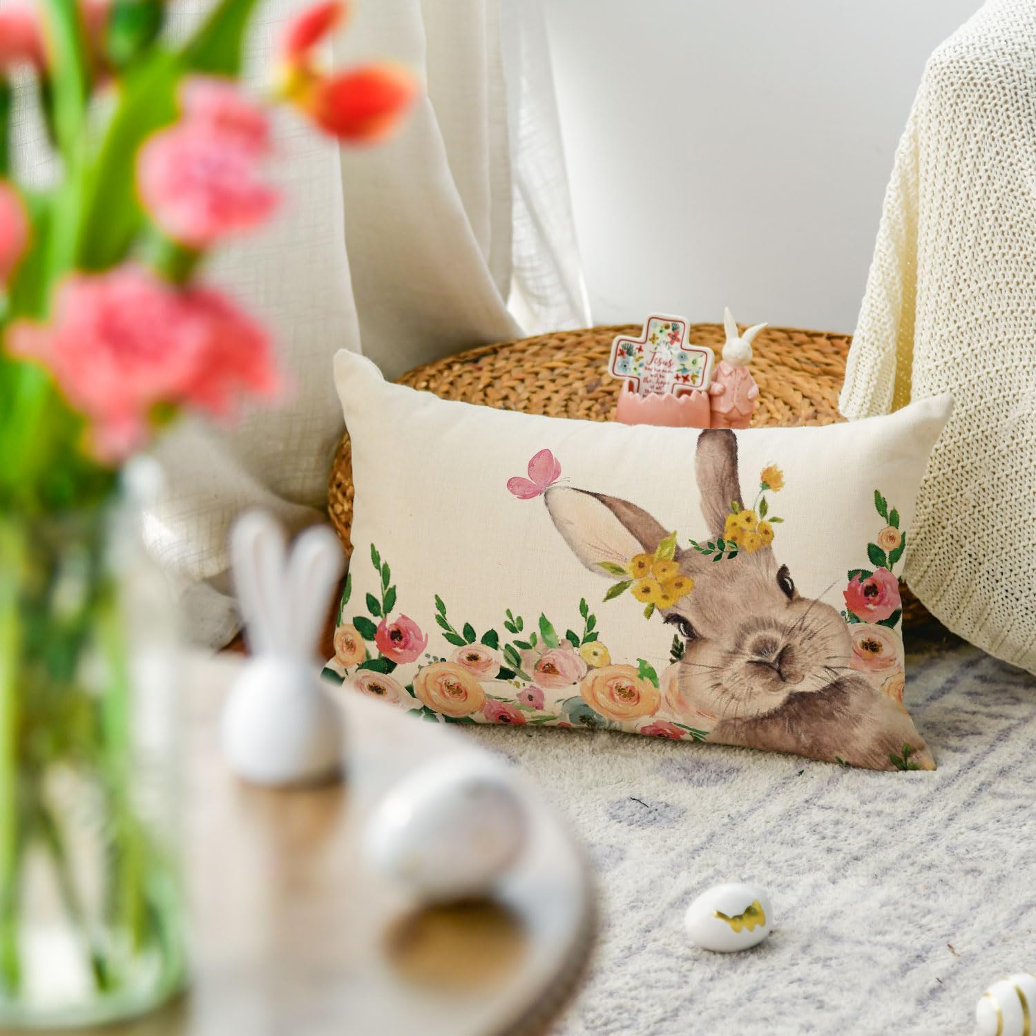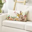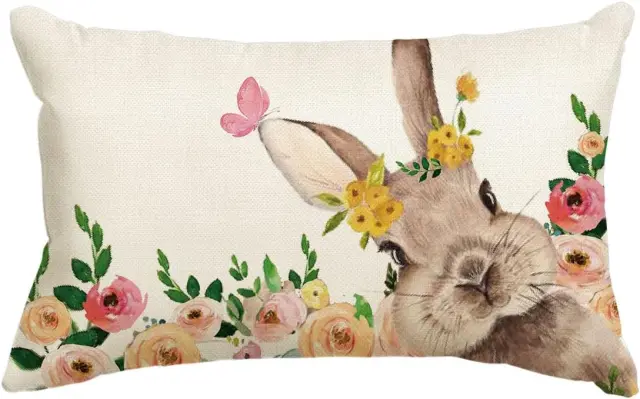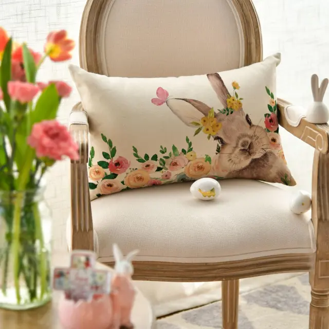 Dekorativna prevleka za blazino Artoid Mode z motivom zajca in cvetja predstavlja odlično izbira za osvežitev vašega bivalnega prostora v pomladnem času. Njen subtilen vzorec s prikupnim zajčkom, metulji in cvetjem vnaša toplo ter veselo razpoloženje v dnevno sobo, spalnico ali pisarno. Izdelek je zasnovan za enostavno uporabo na kavčih, foteljih ali stolih, kjer služi kot estetski in udoben dodatek k obstoječi opremi. Pravokotna oblika in kakovostna izdelava zagotavljata, da se prevleka brez težav vključi v različne stile notranje opreme, od rustikalnega do modernega.