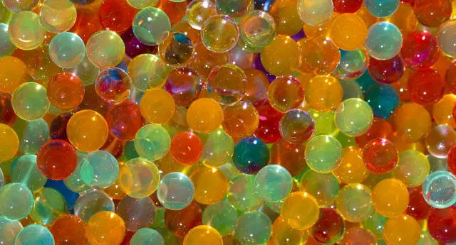 HIDROGEL – kroglice so narejene iz hidrogelne snovi. Je uporabna snov pri vlaženju rož, pa tudi kot okras za prozorne vaze.