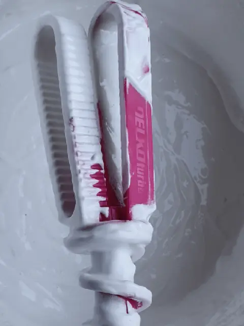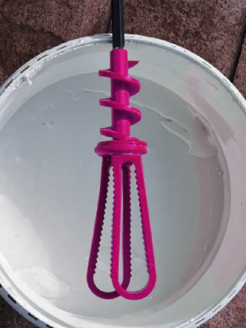 Edinstven in patentiran mešalnik iz trpežne gume. Pri mešanju centrifugalna sila povzroči, da se krogi mešalnika razhajajo za skoraj 180 stopinj. To zagotavlja hitrejše in temeljitejše mešanje, ne da bi morali neprestano premikati mešalo. Ko se preostanek mase posuši na mešalniku, je dovolj, da obroč upognemo, da preostala umazanija odpade.