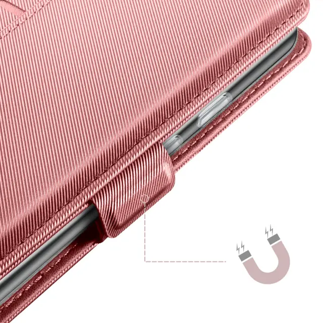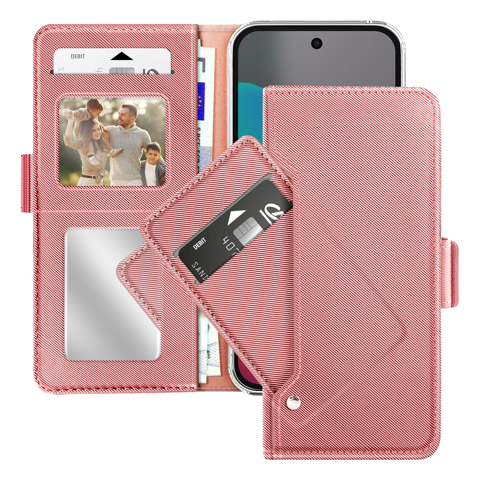 Kovček ima praktične predale za bančne kartice, vozovnice ali dokumente.. Vgrajeno ogledalo je idealno za hitre popravke in vsakodnevno uporabo. Funkcija stojala za gledanje videoposnetkov brez držanja telefona. Dvojno magnetno zapiranje za dodatno varnost.