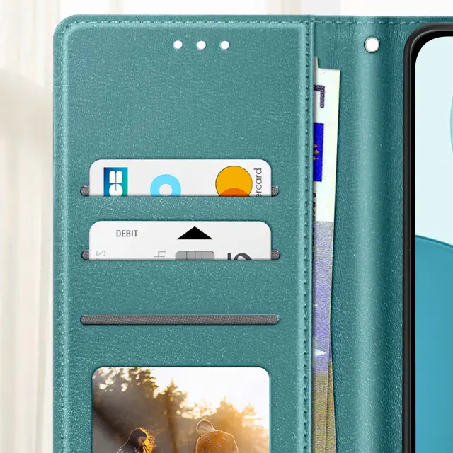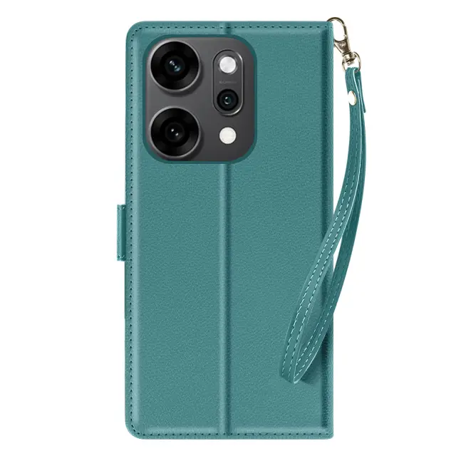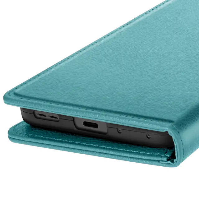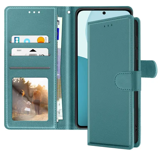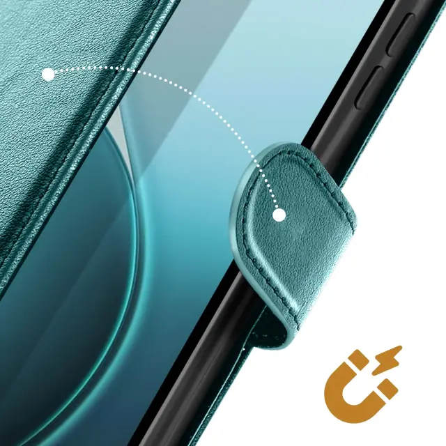 Eleganten in funkcionalen turkizni kovček iz usnja, združljiv z Oppo Reno 14, 14F in 14 FS. Vgrajeni predali za kartice in stranski žep za bankovce. Vgrajena funkcija za podporo videa za udobno gledanje vsebine. Zanesljivo magnetno zapiranje ter mehka notranja lupina, odporna na praske in udarce.