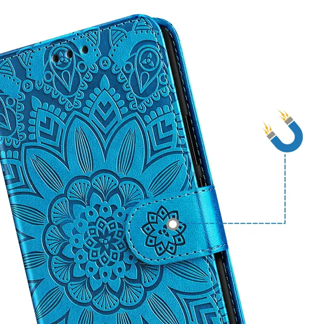 Vzorec mandale, vtisnjen na usnje, zagotavlja prefinjen videz in pametni telefon spremeni v modni dodatek.. Format denarnice s tremi režami za kartice in predalom za bankovce. Mehka silikonska notranja lupina, ki absorbira udarce, za učinkovito zaščito zaslona, vogalov in robov telefona. Vgrajen trak za roko in zložljiv nosilec za videoposnetek za trden oprijem z eno roko ali udobno gledanje brez uporabe rok.