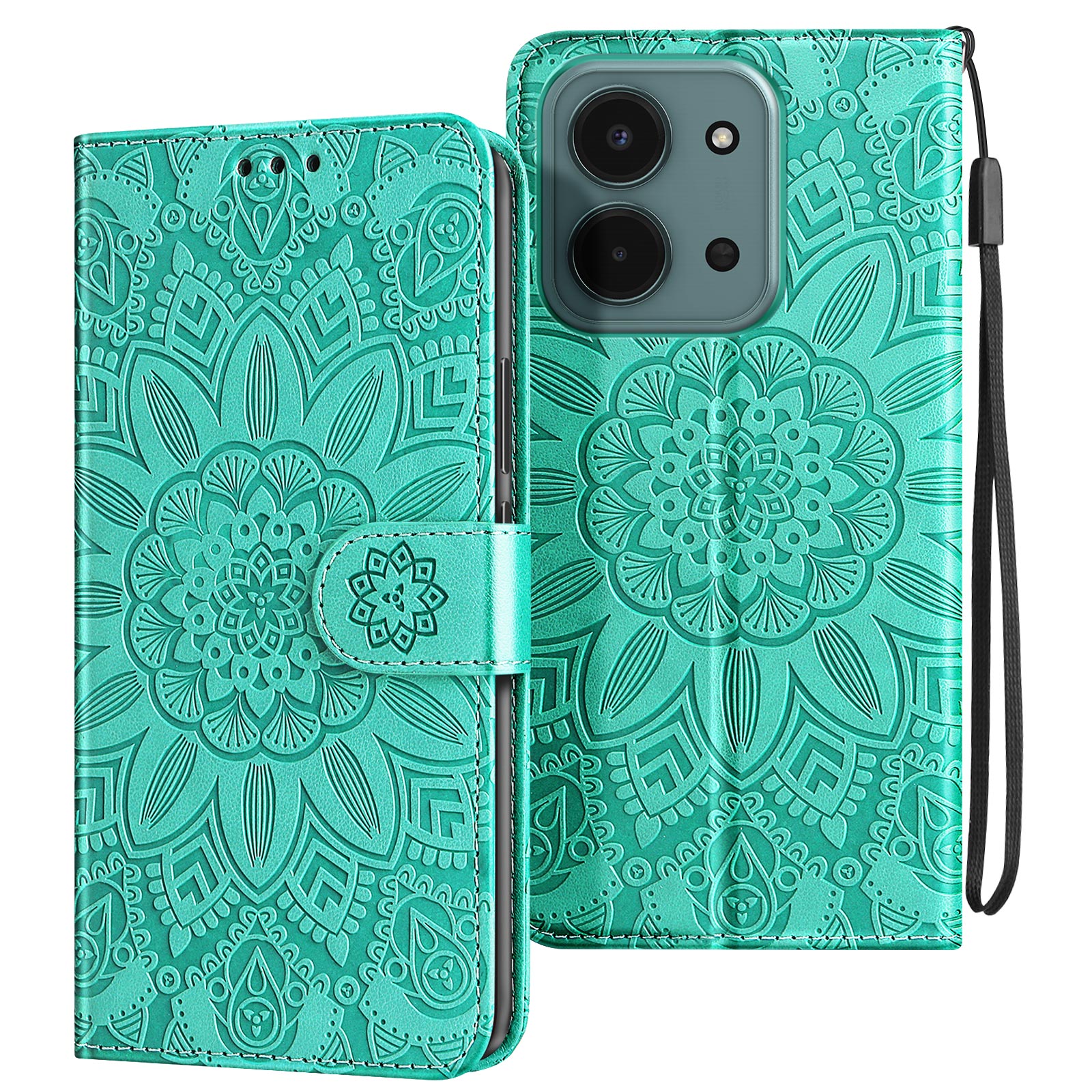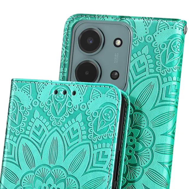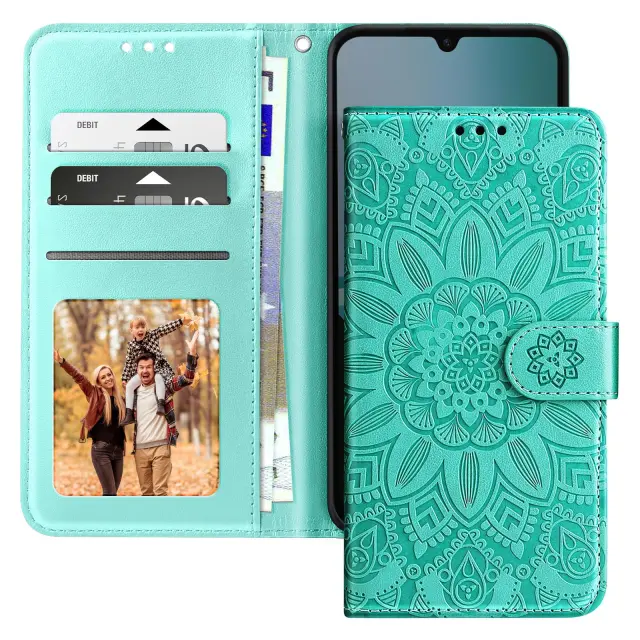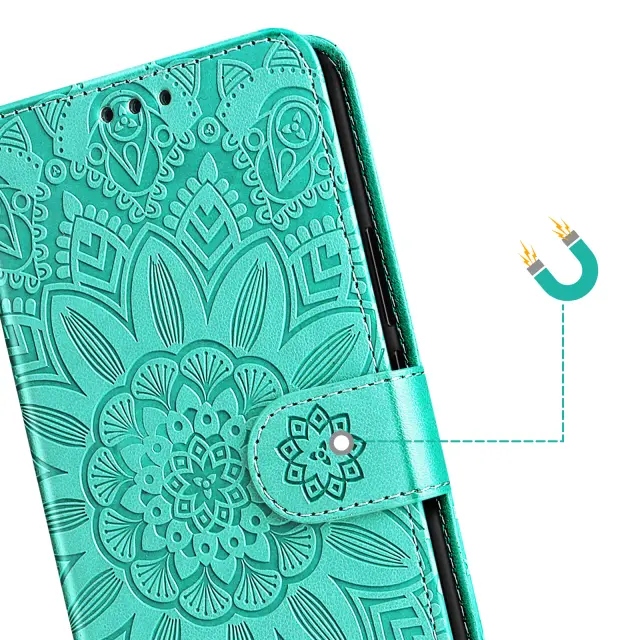 Vzorec mandale, vtisnjen na usnje, zagotavlja prefinjen videz in pametni telefon spremeni v modni dodatek.. Format denarnice s tremi režami za kartice in predalom za bankovce. Mehka silikonska notranja lupina, ki absorbira udarce, za učinkovito zaščito zaslona, vogalov in robov telefona. Vgrajen trak za roko in zložljiv nosilec za videoposnetek za trden oprijem z eno roko ali udobno gledanje brez uporabe rok.