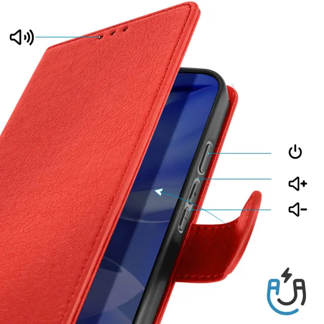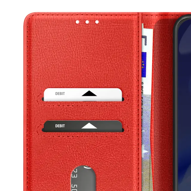 Ta rdeč denarniški etui za Google Pixel 9a je izdelan v barvi Chesterfield in ima zrnato površino, kar zagotavlja trezen in prefinjen videz.. Na notranji strani zavihka sta dve navpični reži, namenjeni vstavljanju bančnih kartic, priponk ali potovalnih vozovnic.. Notranji stranski predal omogoča, da so zapiski in računi lepo poravnani, ne da bi ovirali magnetno zapiranje.. Trdna polikarbonatna lupina trdno obdaja vaš pametni telefon ter ščiti obrise in fotografski modul..