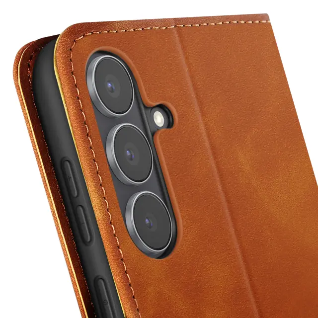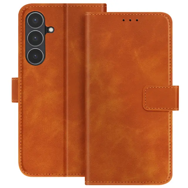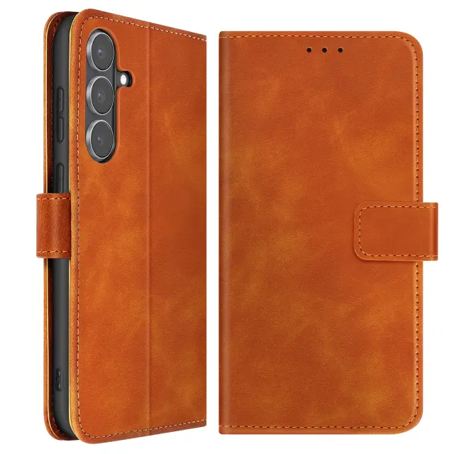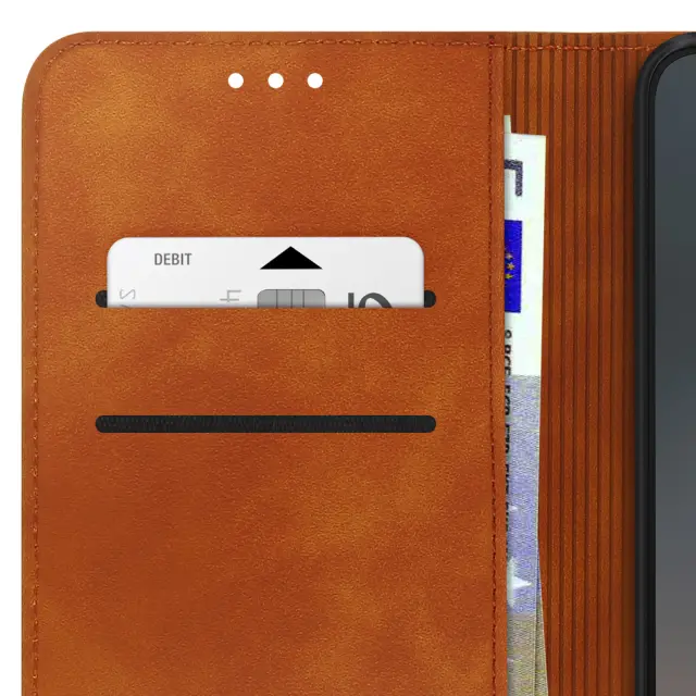 Ta rjava denarnica z učinkom semiša ščiti vaš Galaxy S25 FE z mehko notranjo lupino iz TPU, ki učinkovito absorbira udarce.. Mehka, žametna prevleka je prijetna na otip ter je odporna na sledi in odrgnine.. Kovček ima dve reži za kartice ali značke in stranski žep za zapiske ali nekaj računov.. Zavihek z magnetnim zavihkom zagotavlja varno zaprtje paketa in preprečuje nenamerno odpiranje..