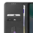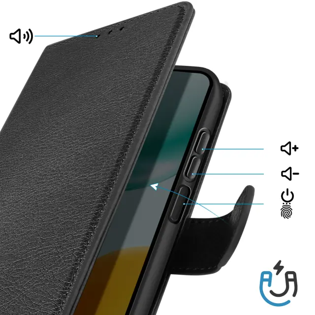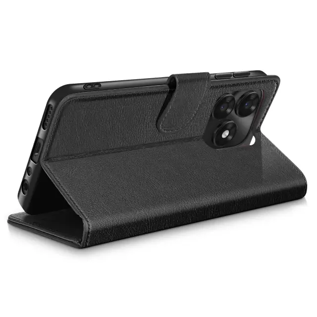 Premium Chesterfield stil s črnim zrnatim usnjem za eleganten vsakdanji videz. Praktično shranjevanje s tremi režami za kartice in predalom za bankovce, integriranim v zavihku. Stabilen vodoravni način podpore je idealen za prostoročno predvajanje videoposnetkov in video klice. Strukturirana zaščita z mehko silikonsko lupino in magnetnim jezičkom za pritrditev pametnega telefona.