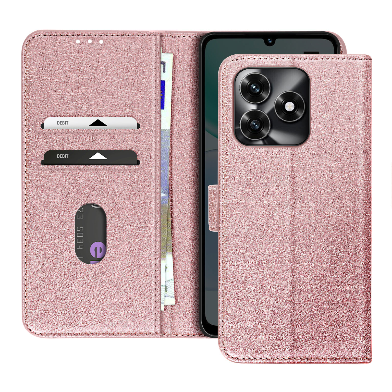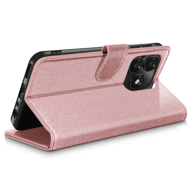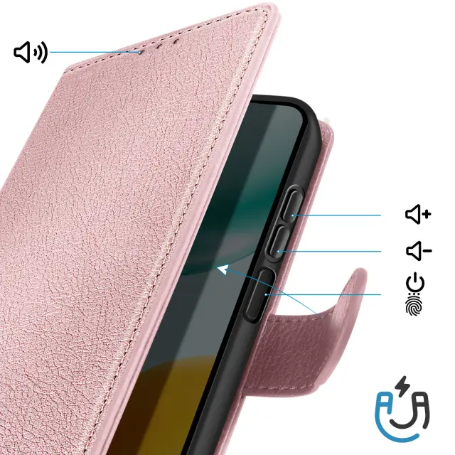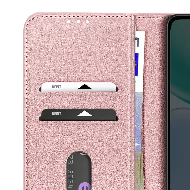 Premium Chesterfield stil z rožnato zrnato imitacijo usnja za eleganten vsakdanji videz. Praktično shranjevanje s tremi režami za kartice in predalom za bankovce, integriranim v zavihku. Stabilen vodoravni način podpore je idealen za prostoročno predvajanje videoposnetkov in video klice. Strukturirana zaščita z mehko silikonsko lupino in magnetnim jezičkom za pritrditev pametnega telefona.