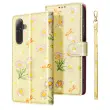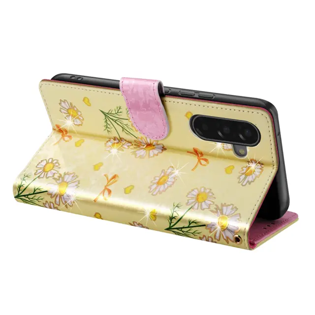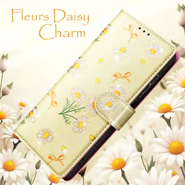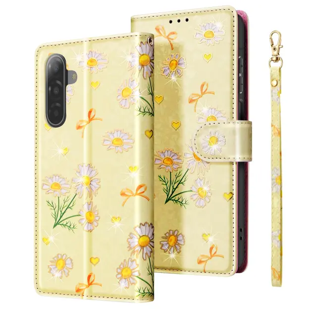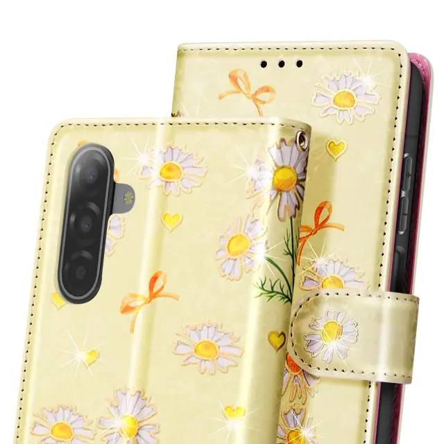 Ta etui ima notranji predal za kartice in zapiske.. Marjetice z okrasnimi loki na rumenem ozadju. Praktična funkcija za podporo videa za prostoročno gledanje. Magnetno zapiranje z zanesljivim zatičem.