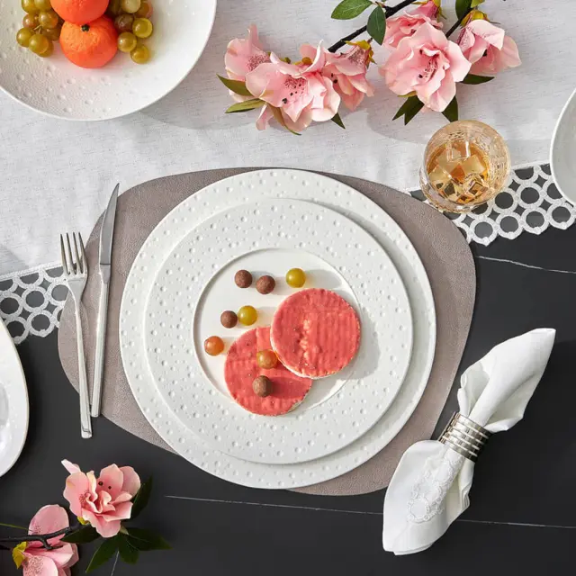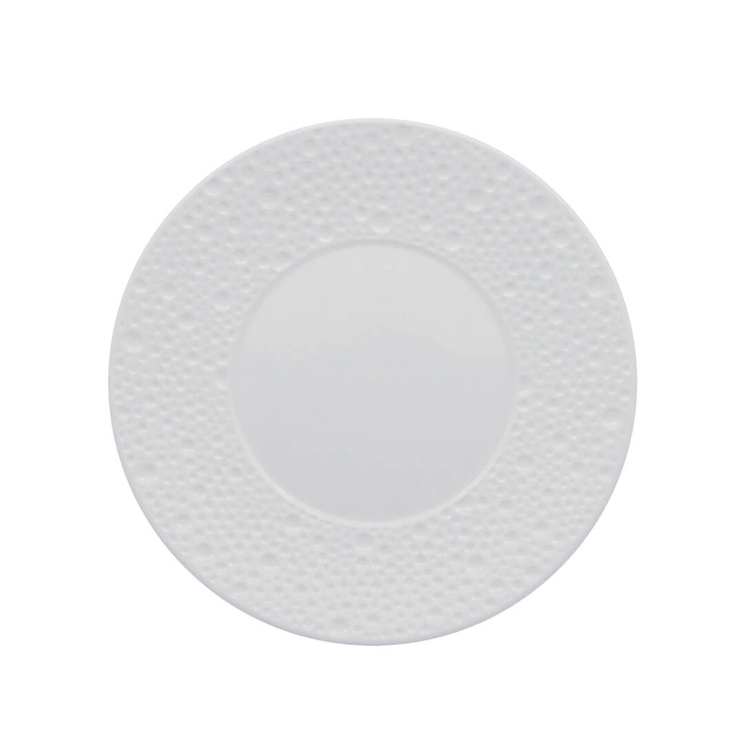 Eleganten bel desertni krožnik Deva odlikuje edinstvena reliefna dekoracija, ki spominja na lunino površje. Ta dodaja sodoben pridih klasični beli liniji, kar omogoča popolno prilagodljivost krožnika v vsakem okolju. Porcelan je obogaten z aluminijevim oksidom, ki zagotavlja večjo odpornost kot običajni materiali, večjo trdnost in videz polirano zaključenega premaza. Krožnik premera 20,9 cm je primeren za uporabo v mikrovalovni pečici in pomivanje v pomivalnem stroju. NAMIG: Kombinirajte ga še z ostalimi izdelki iz iste linije Deva.