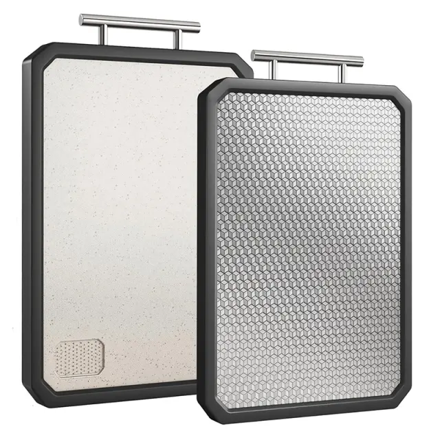 Vsestranska zasnova: Ta deska za rezanje ima dvostransko zasnovo in ponuja trpežno površino iz nerjavečega jekla za sekljanje ter stran iz pšenične slame PP, ki je idealna za gnetenje testa ali razvaljanje peciva.