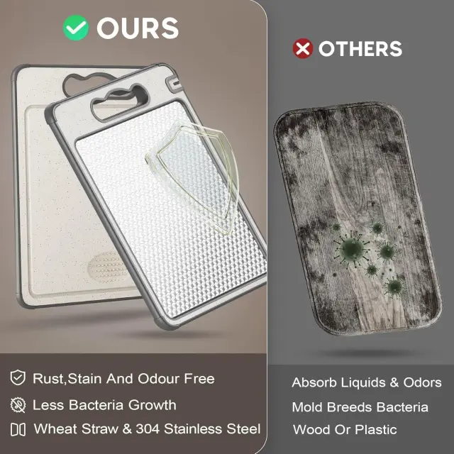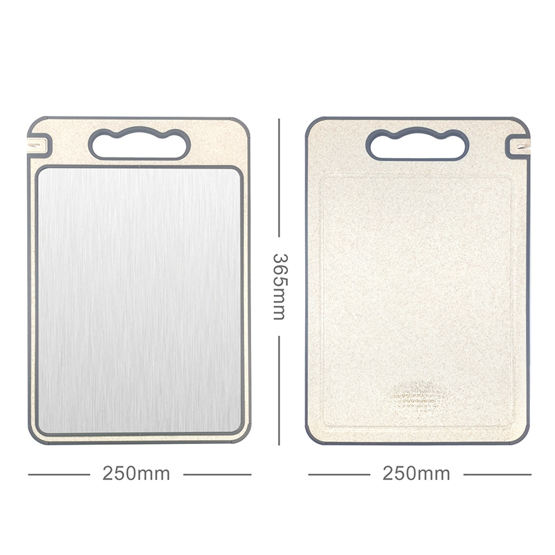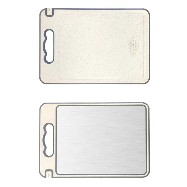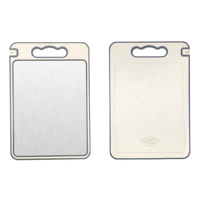 Dvostranska zasnova: Ta deska za rezanje ima dvostransko zasnovo, ki zagotavlja vsestranskost v kuhinji. Ena stran je izdelana iz nerjavečega jekla, ki je idealna za rezanje mesa, rib in zelenjave, druga stran pa je izdelana iz PP iz pšenične slame, ki je kot nalašč za gnetenje testa, razvaljanje peciva in sekljanje občutljivih sestavin.