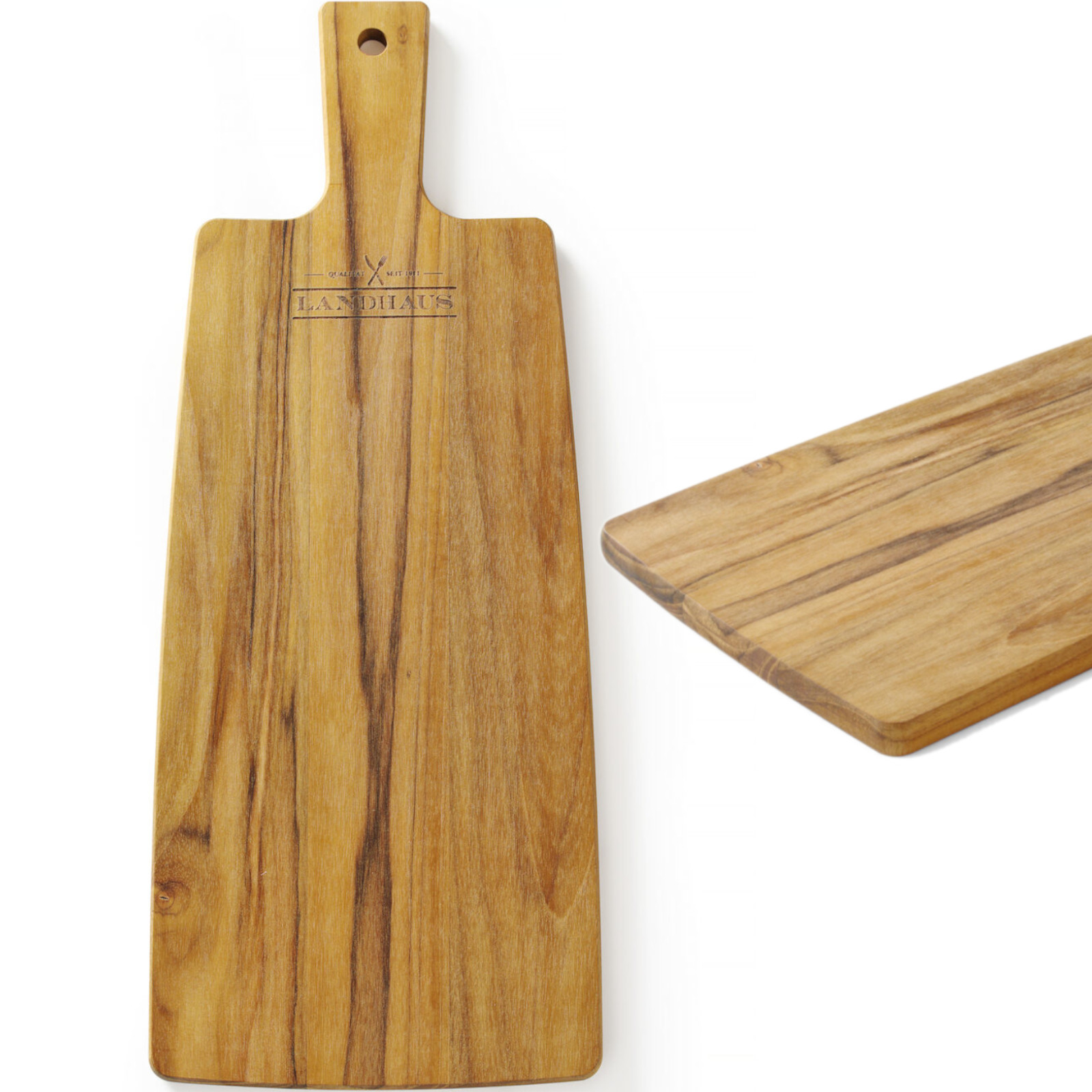 Deska za rezanje Tramontina je odlična za sekljanje, rezanje in serviranje prigrizkov. Prijazen je do kuhinjskih rezil, je odlično odporen na poke in ureznine, nanj lahko postavite vroče predmete (lonce, skodelice ali ponve). Izdelan je iz visoko kvalitetnegatikovegalesa, s certifikatomFSC®. Ima naravno antibakterijsko zaščito. Ročaj z luknjo za obešanje olajša uporabo.