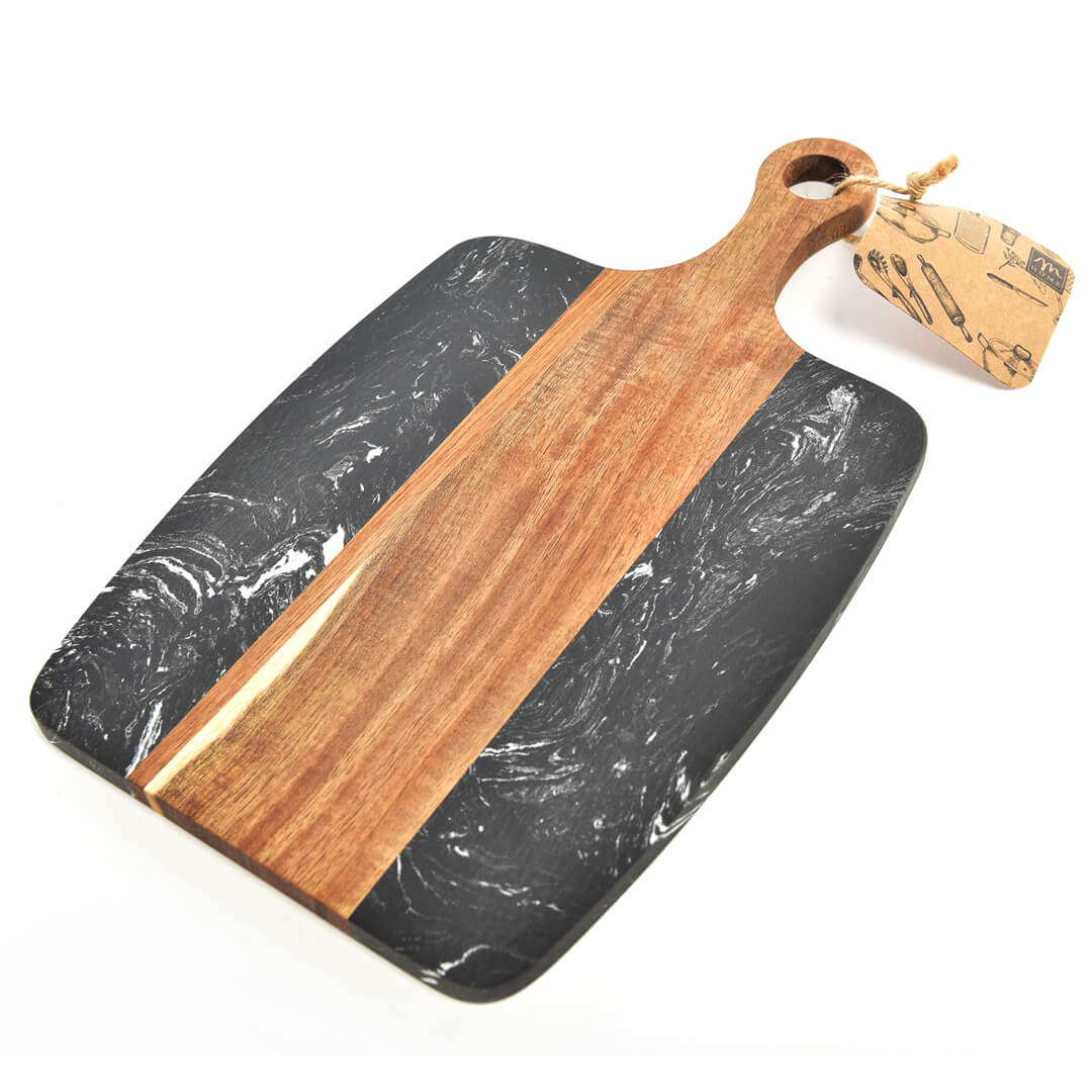 Čudovita rezalna deska združuje eleganco črnega marmorja s toplino naravnega lesa, kar ustvarja prefinjen dodatek za vsako kuhinjo ali jedilnico. Izdelana je iz črnega marmorja, ki daje prestižen videz vsakemu kuhinjskemu prostoru. Osrednji lesen del deske je podaljšan v ročaj, ki omogoča enostavno prenašanje in dopolnjuje estetiko marmorja. S svojo velikostjo 35 x 20 cm je deska dovolj prostorna za rezanje in pripravo različnih sestavin, od zelenjave do mesa. Pomijte jo ročno in dobro posušite.