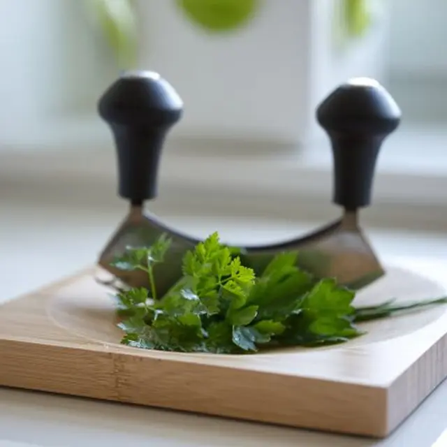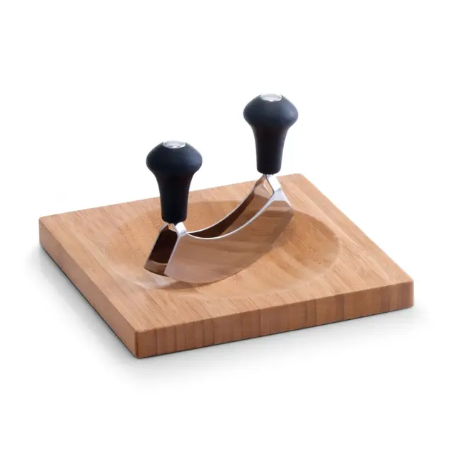 Rezalna deska iz bambusovega lesa je zaradi ukrivljene zasnove idealna za sekljanje svežih zelišč in zelenjave. Nož za rezanje, z dvojnim rezilom v obliki polmeseca, je izdelan iz kakovostnega nerjavečega jekla. Zahvaljujoč dvema ergonomsko oblikovanima ročajema iz plastike, pa je rezanje hitro in enostavno. Izdelek je idealen pripomoček za sekljanje brez prask na kuhinjskem pultu. Pomijte ročno.
