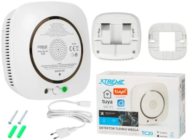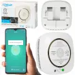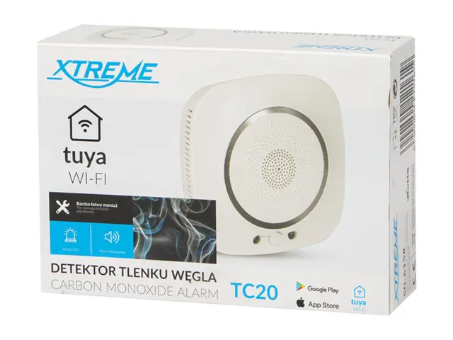 Senzorski detektor XTREME CO z možnostjo konfiguracije naprave z vgrajenim Wi-Fi in namensko aplikacijo TUYA SMART LIFE. Če zazna ogljikov monoksid, senzor izda zvočna in optična opozorila z rdečo diodo.